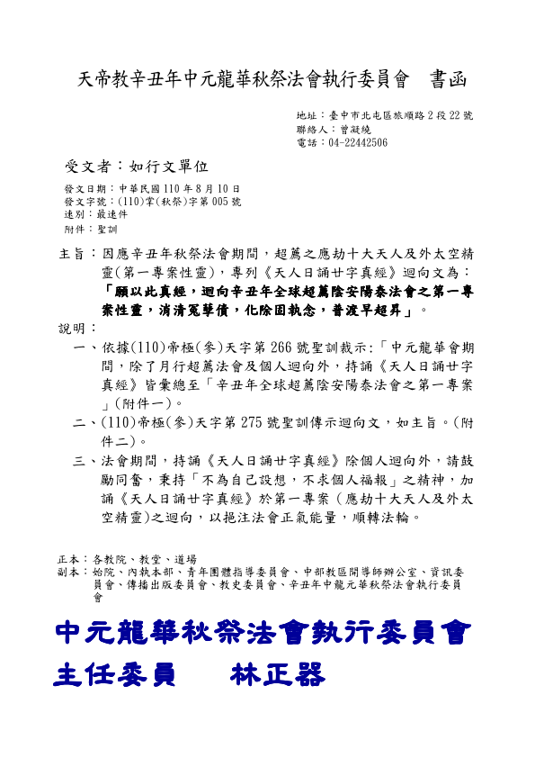 中元龍華會期間,除月行超薦、個人特別迴向(念給先祖、先靈、冤親債主)外,持誦《廿字真經》皆彙總至辛丑年全球超薦陰安陽泰法會之第一專案。