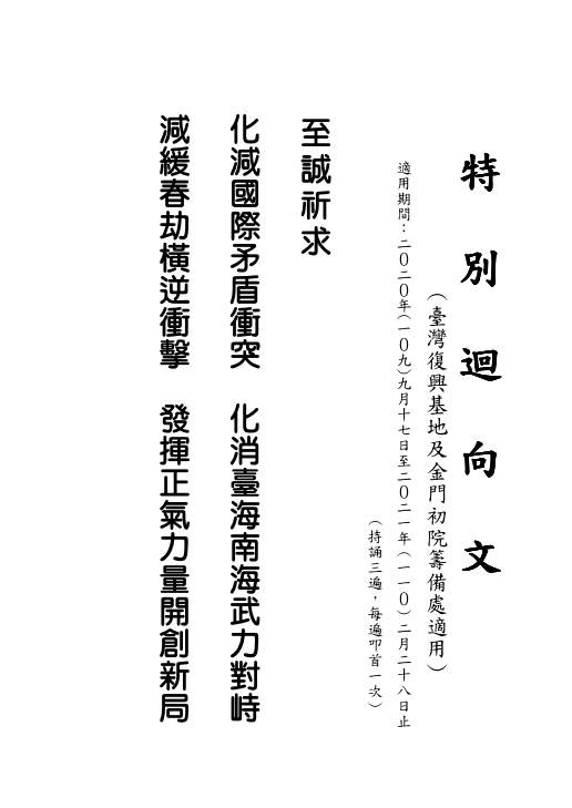 迴向文部分,復興基地以現行的迴向文為主,從109年9月17日至110年2月28日止,如遇特殊狀況,再另行通知。