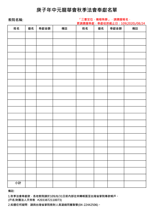 同時,更呼籲全教同奮「踴躍奉獻」,以厚實庚子年秋祭法會相關建置,壯闊難得氣勢。