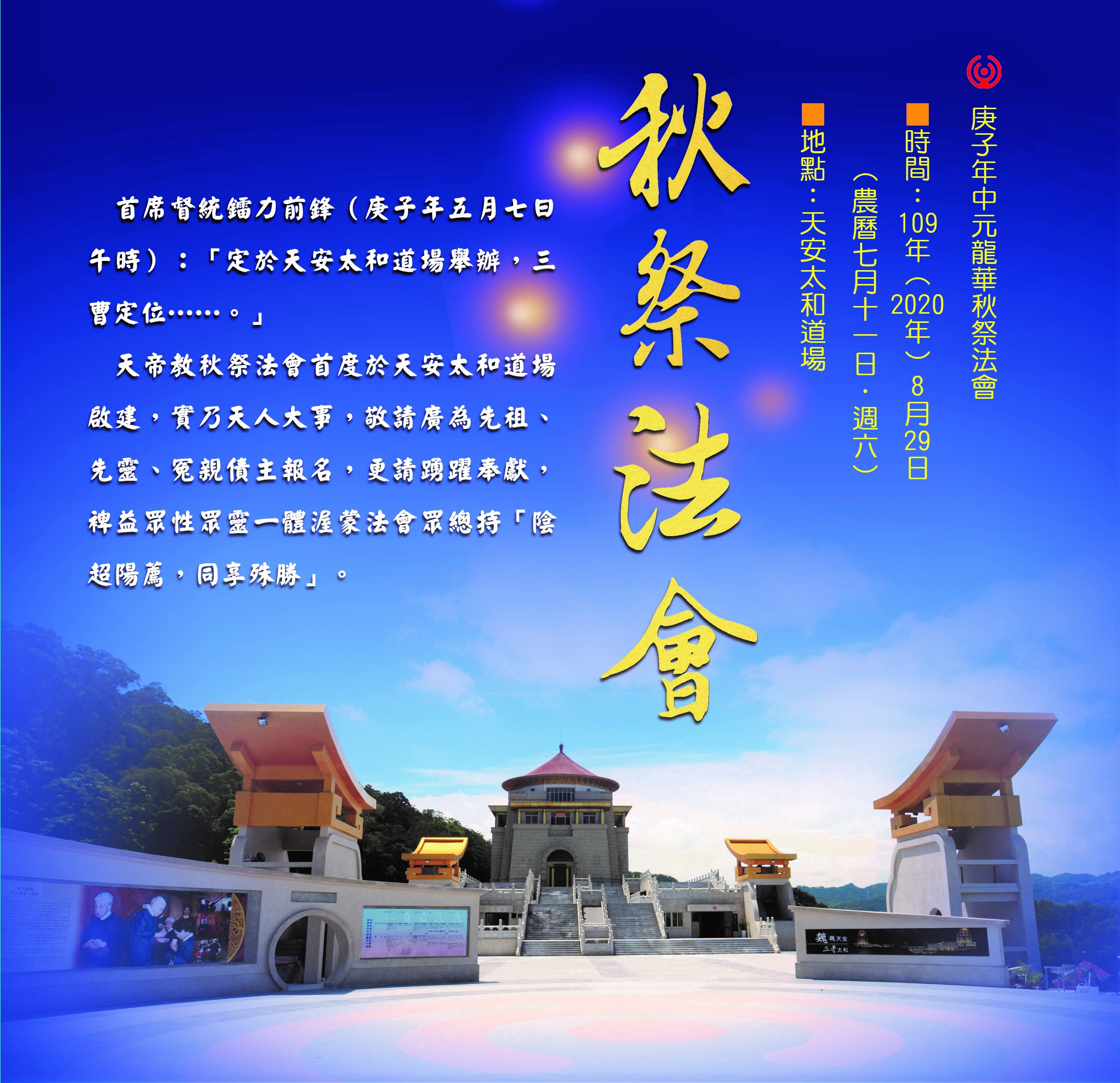 秋祭法會,是天帝教年度陰超陽薦大事,啟建26年以來,均暫由人曹道場天極行宮替行。如今,時機圓熟,無形核可,庚子年秋祭法會定於天安太和道場舉行,等於「歸建本位」,意義非凡。
