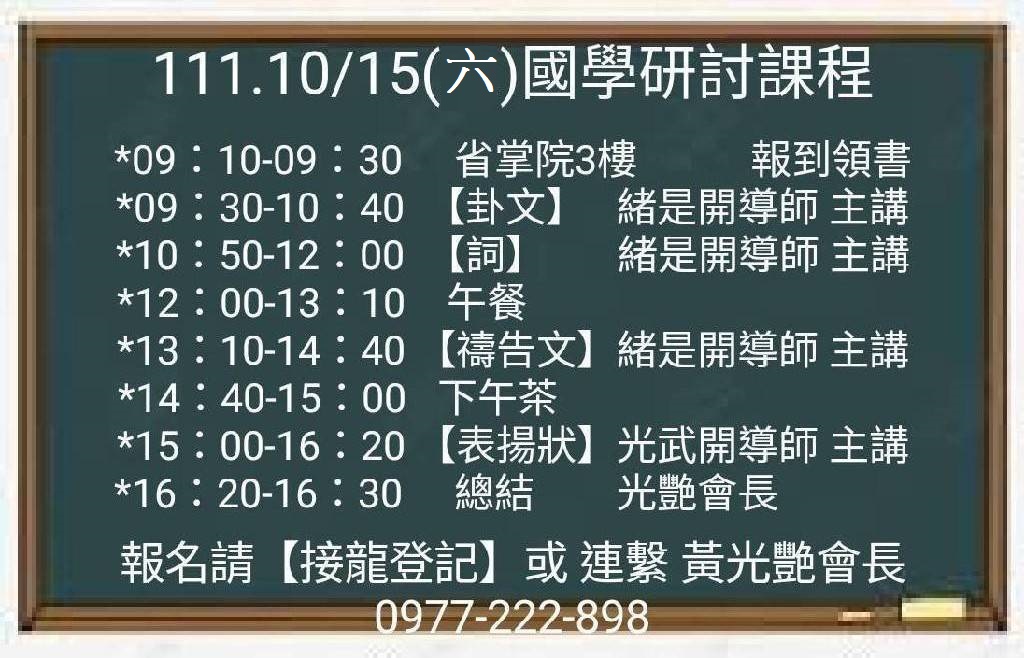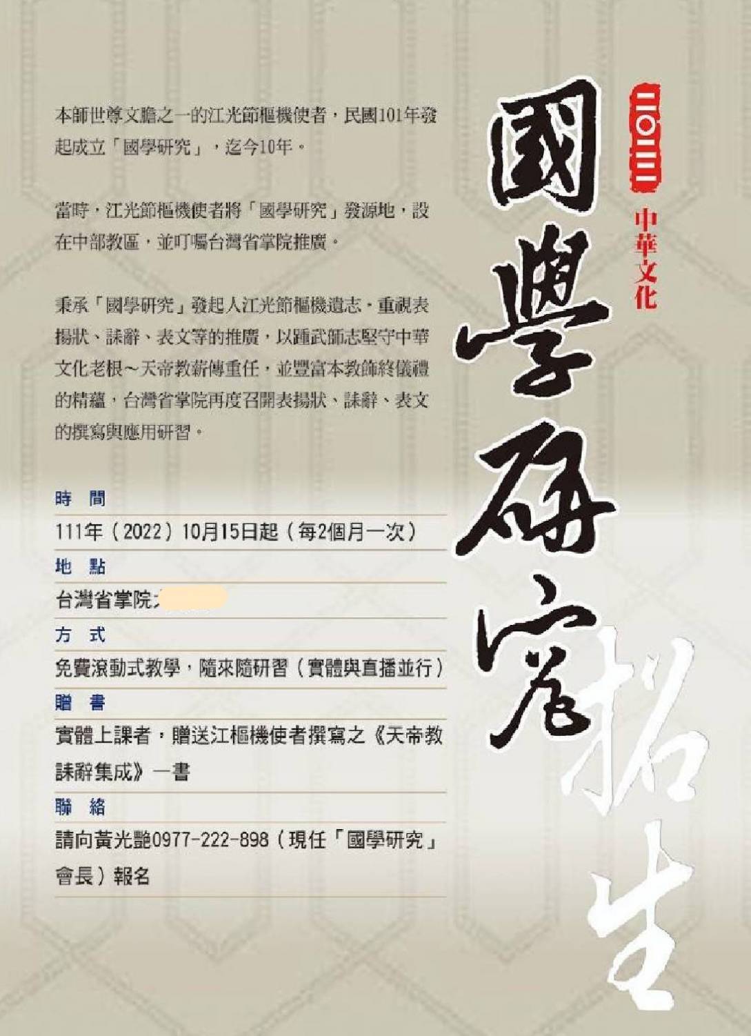 20餘年前,由江光節樞機使者發起的國學研究,今年10月15日上午9時起,將在台灣省掌院再度展開研習。