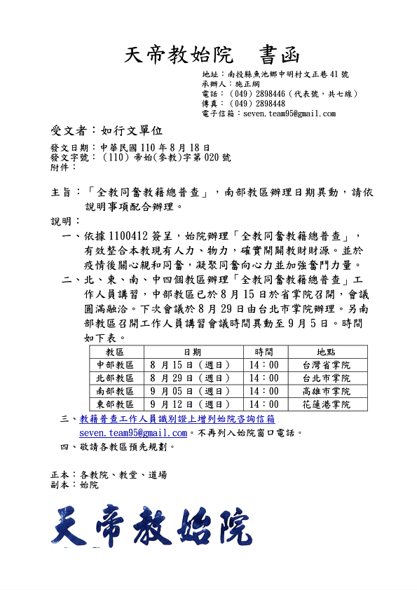 ★始院110年(2021)8月15日起 進行「全教同奮教籍總普查」 by 教訊總編 · Published 08/10/2021 · Updated 08/18/2021 為有效整合本教現有人力、物力,確實開闢教財財源,並於疫情後關心親和同奮,凝聚同奮向心力,強化奮鬥力量。始院於復興基地北、東、南、中四個教區,進行「全教同奮教籍總普查」。 詳情(8月18日更新版)如下: