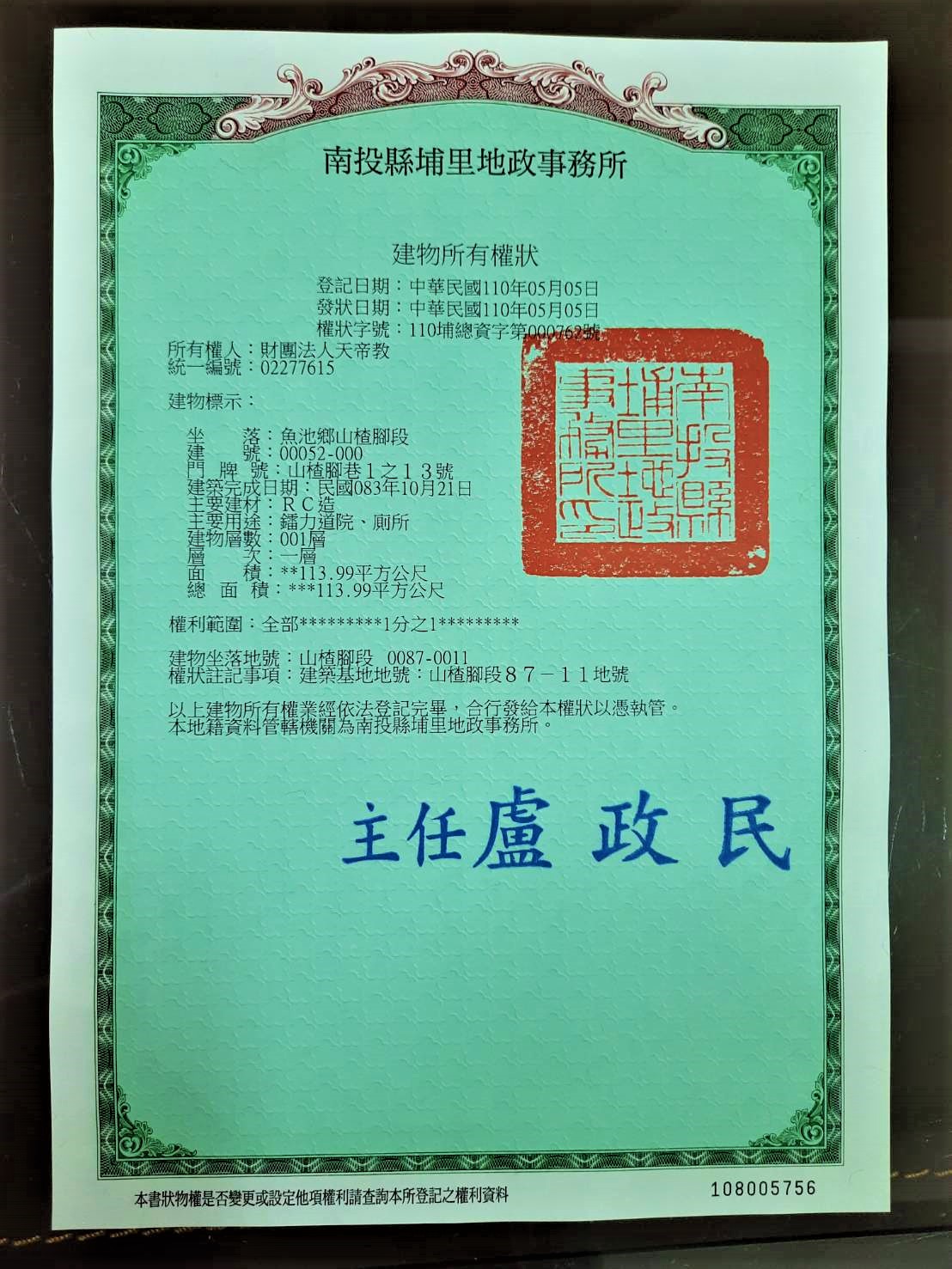 ★鐳力道院前院「所有權狀」110年(2021)5月5日拿到了! by 教訊總編 · 05/06/2021 ★本師世尊、坤元輔教誕辰(農曆四月四日、四月五日)前夕,鐳力道院前院「所有權狀」終於拿到了! 鐳力阿道場既有建築物全部登記完成,可以合法使用了!