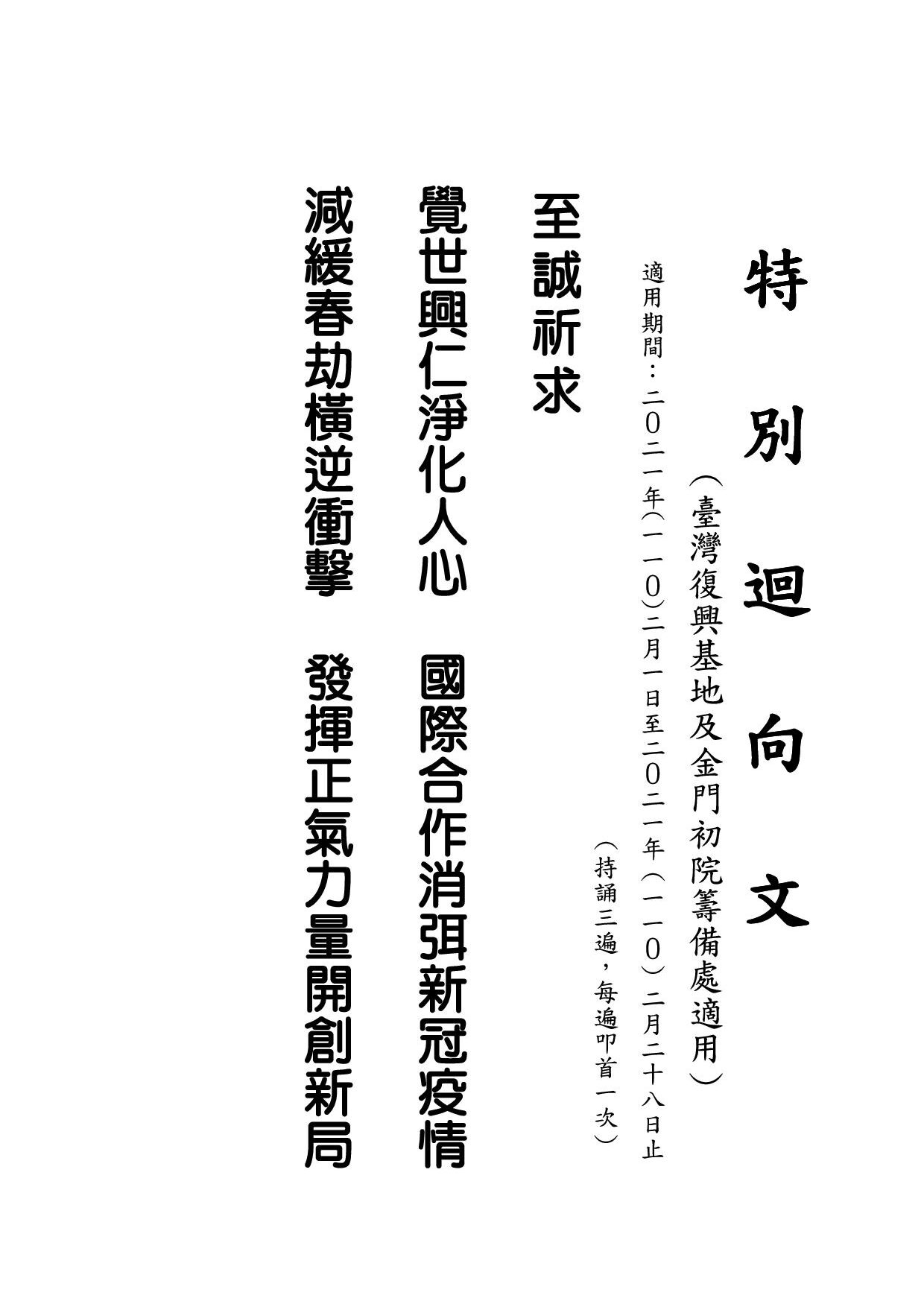 ★110年2月1日至28日復興基地更新迴向文 by 教訊總編 · 02/01/2021 由於全球新冠疫情居高不下,茲奉(110)帝極(參)天字第053聖訓,首席督統鐳力前鋒聖訓指示:因應當前春劫行運之變局,新冠疫情之嚴峻,核定新「特別迴向文」,祈求減緩春劫及疫情衝擊。 適用時間:2021年2月1日至28日止。 適用地區:臺灣復興基地及金門初院籌備處。
