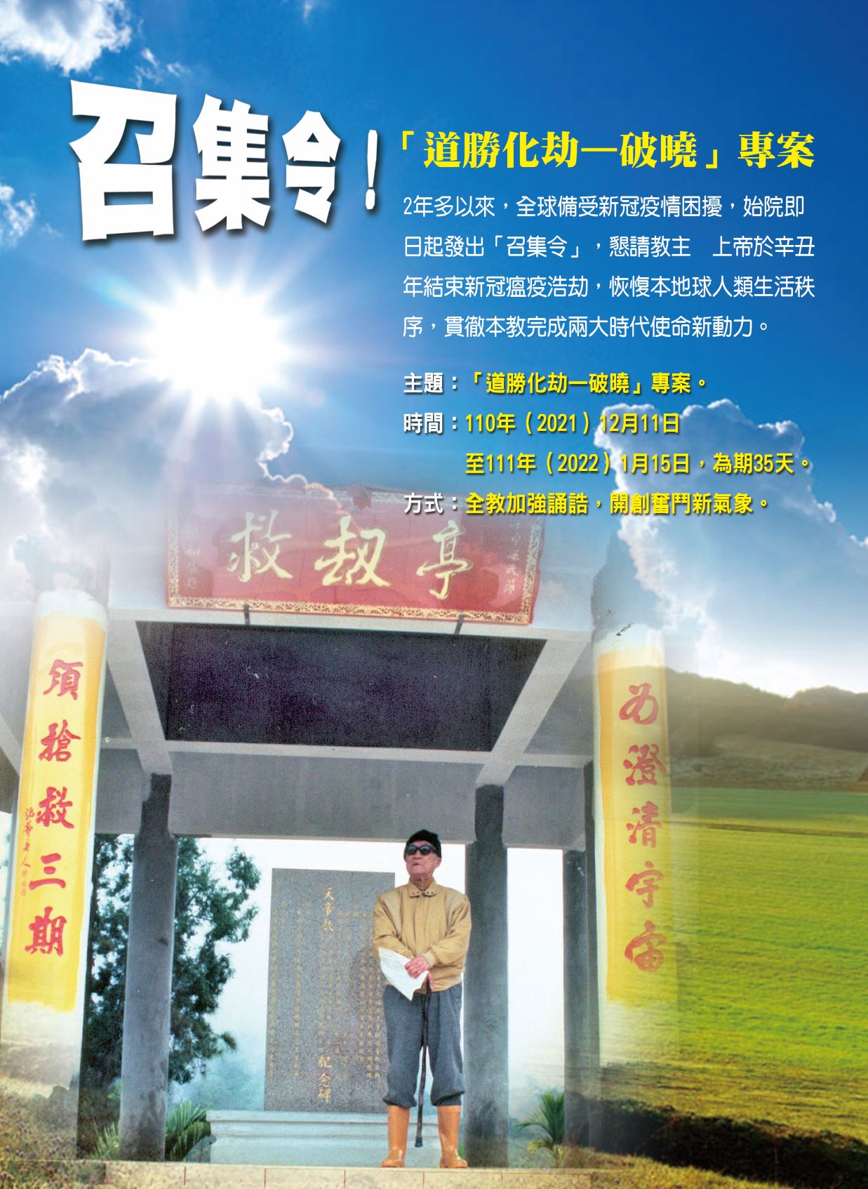 2年多來,全球備受新冠疫情困擾,始院即日起發出「召集令」,懇請教主 上帝於辛丑年末結束新冠瘟疫浩劫,恢愎本地球人類生活秩序,貫徹本教完成兩大時代使命新動力;推動從110年(2021)12月11日至111年(2022)1月15日,為期35天的「道勝化劫—破曉」專案,號召全教加強誦誥。