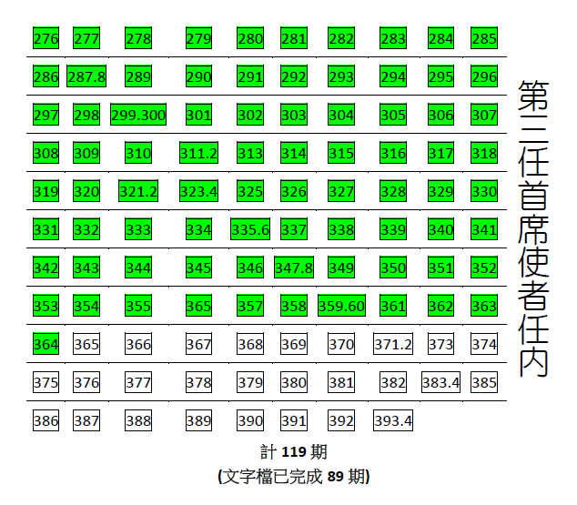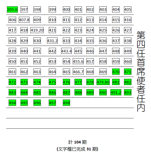 1. [PDF電子書下載] 創刊001~004、第001~498期<<最新出刊教訊>>。(總編號為502) 2. [文字線上瀏覽],目前完成 79% 。歡迎〈線上閱讀〉與〈研究搜尋〉 (文章累計篇數:14100) 創刊001~004、第001~364期 、第395.396期,以及第470~498期。(總編號為502 已完成399/502) (下列圖示中,綠色標示者為已完成[文字線上瀏覽]的部分)