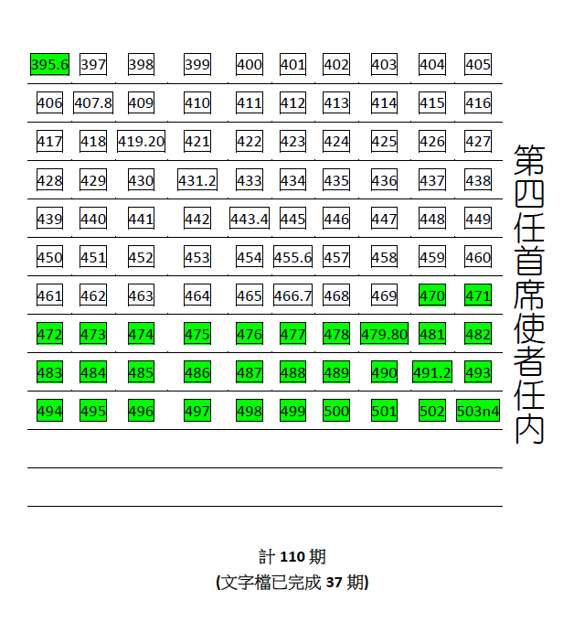 1. [PDF電子書下載] 創刊001~004、第001~503.504期<<最新出刊教訊>>。(總編號為508) 2. [文字線上瀏覽],目前完成 80% 。歡迎〈線上閱讀〉與〈研究搜尋〉 (文章累計篇數:14386) 創刊001~004、第001~368期 、第395.396期,以及第470~503.504期。(總編號為508 已完成409/508) (下列圖示中,綠色標示者為已完成[文字線上瀏覽]的部分)